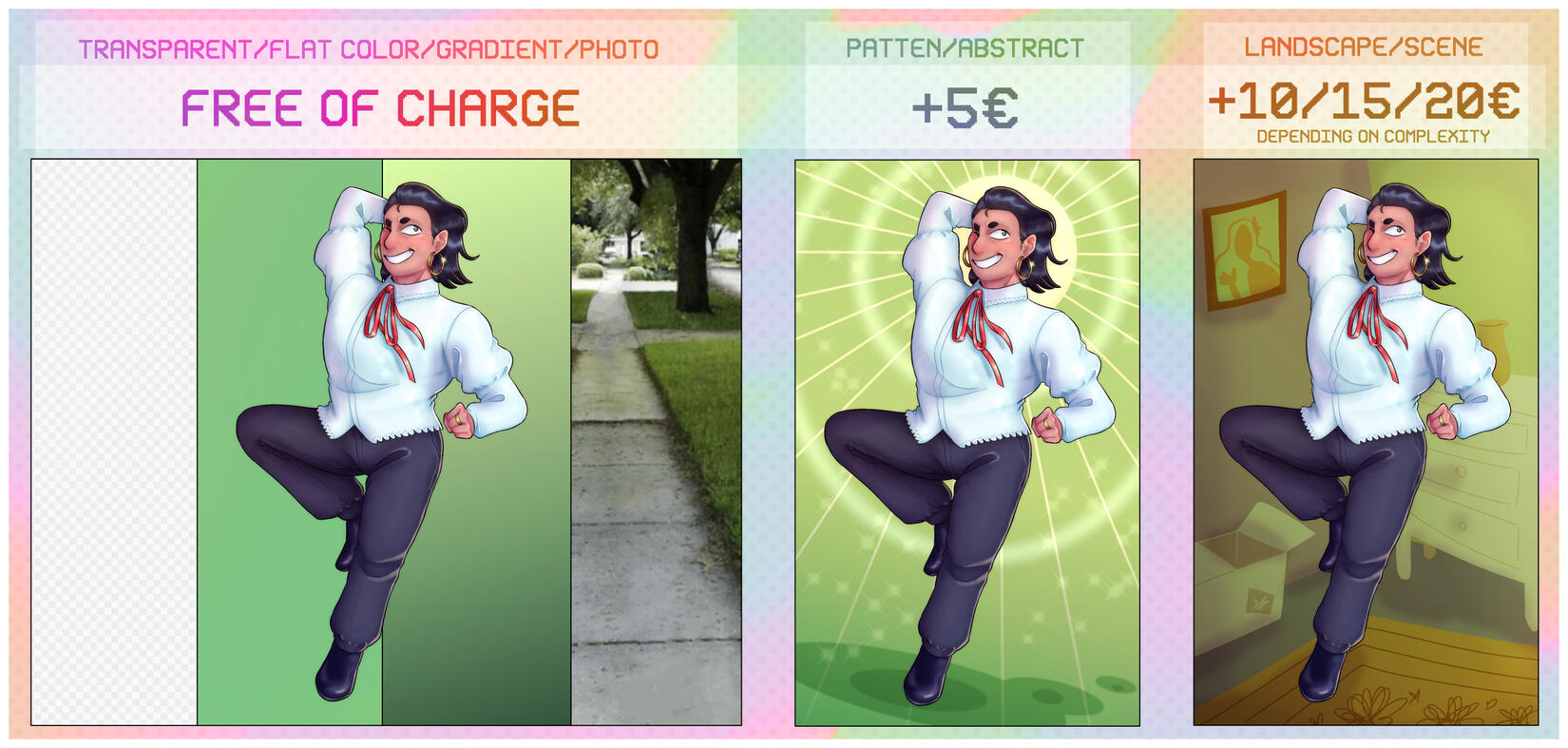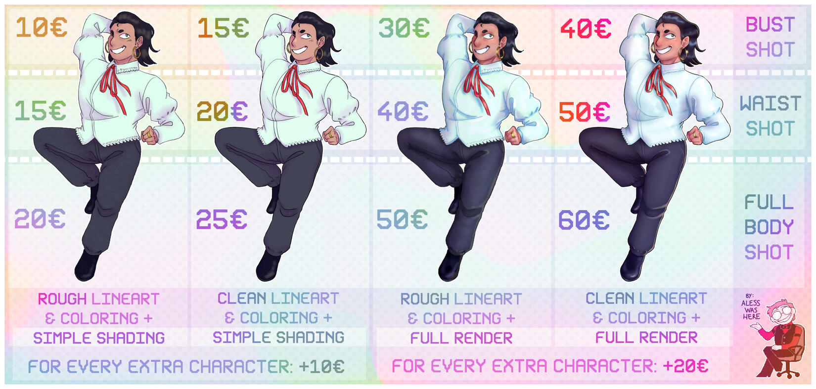 Payment is through Paypal invoice or Steam gift card (the former is preferred).Payment will be sent beforehand or at sketch approval.I'm open to discussion over the price and details of your piece (but please don't try to haggle me).If desired, I'll send progress shots throughout the drawing process in case changes are to be requested (which you shouldn't be afraid to ask for!) Just know that the nearer I am to finishing the piece, the fewer changes I will apply.There are no refunds. You can only change your mind during the sketching process/before I start working on the lineart.I have the right to deny a commission and I'm not obligated to provide reasons for such.Please do not remove my signatures, repost my art without credit, resell and/or make merch out of my art. No NTFs either.